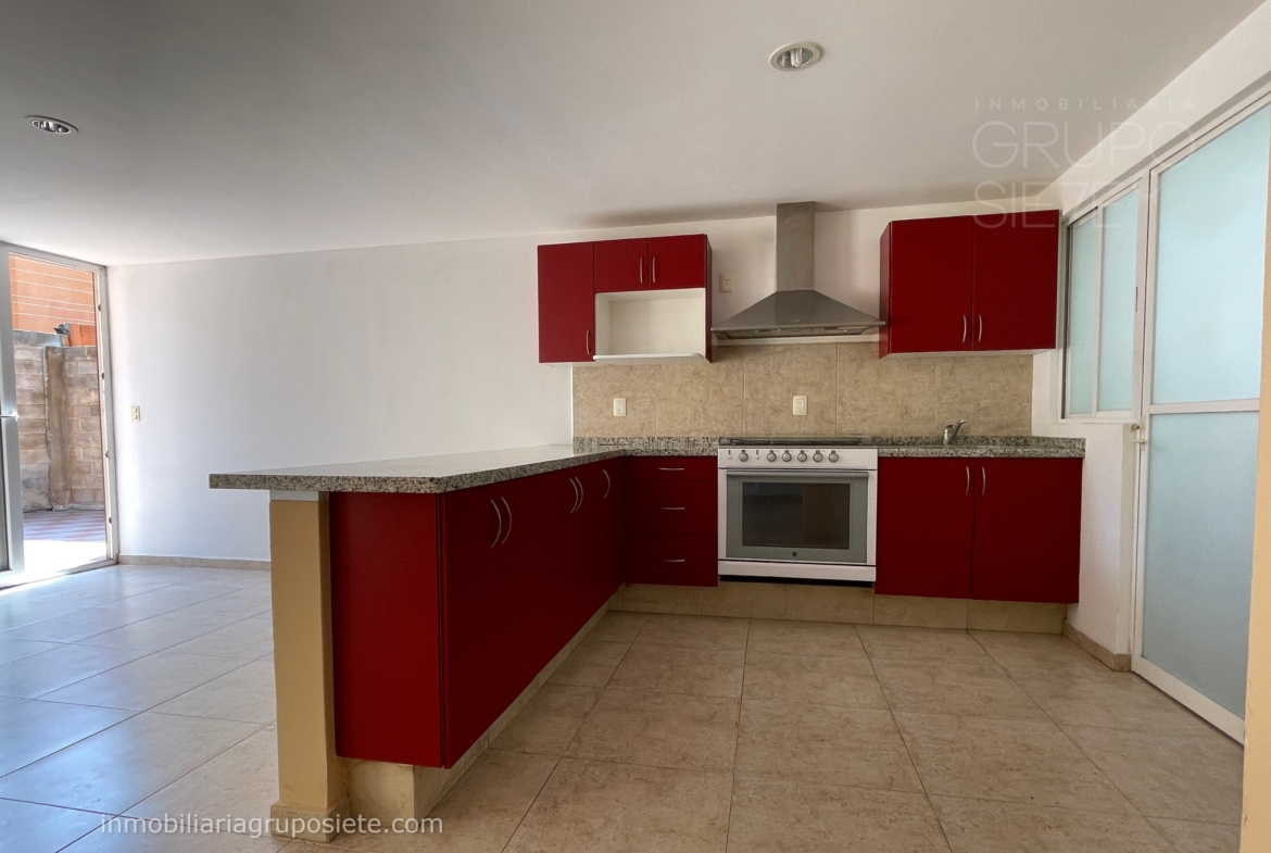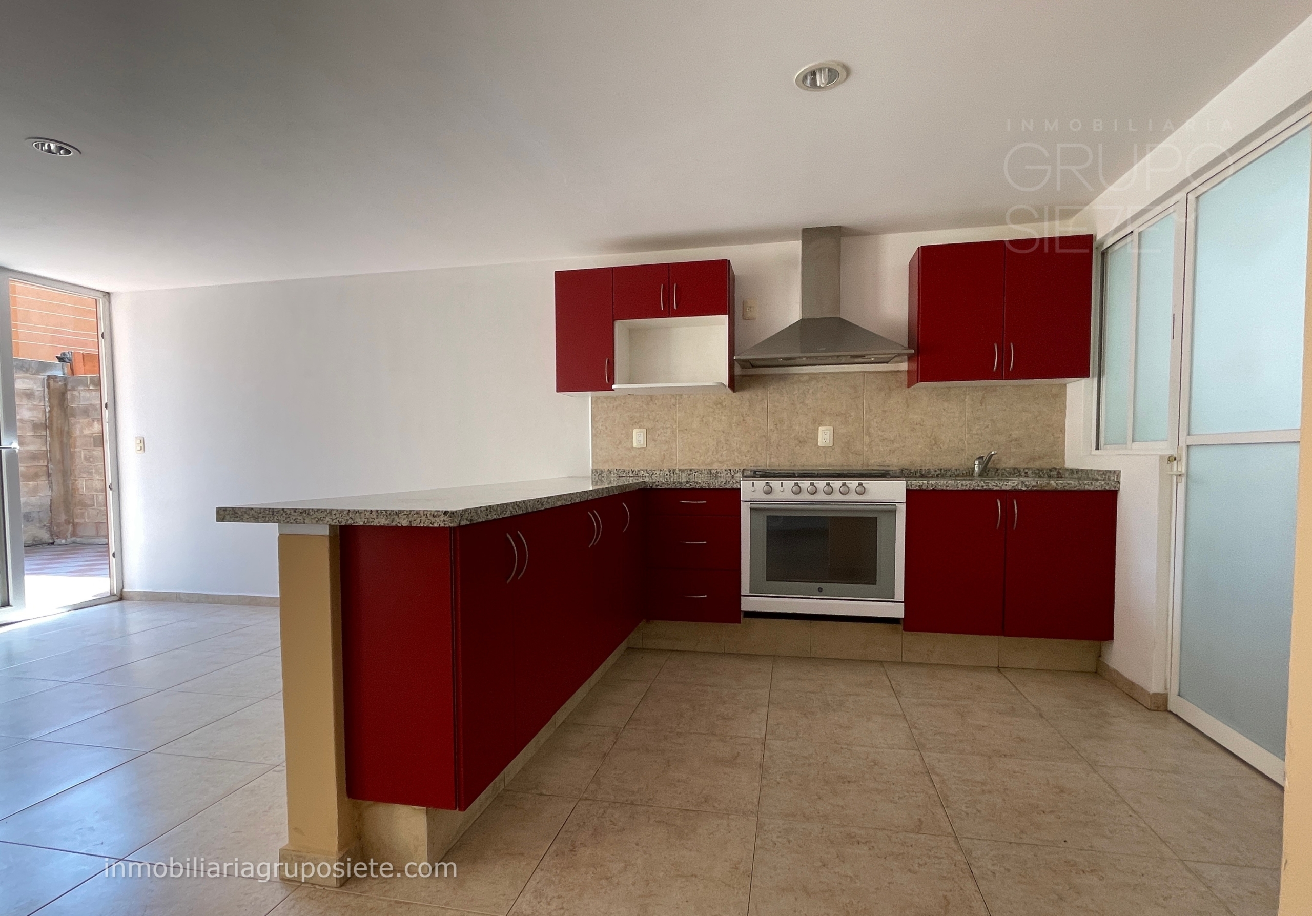 Cocina integral color rojo, con horno eléctrico y área de lavado