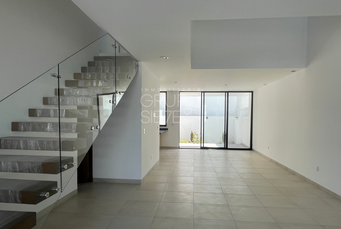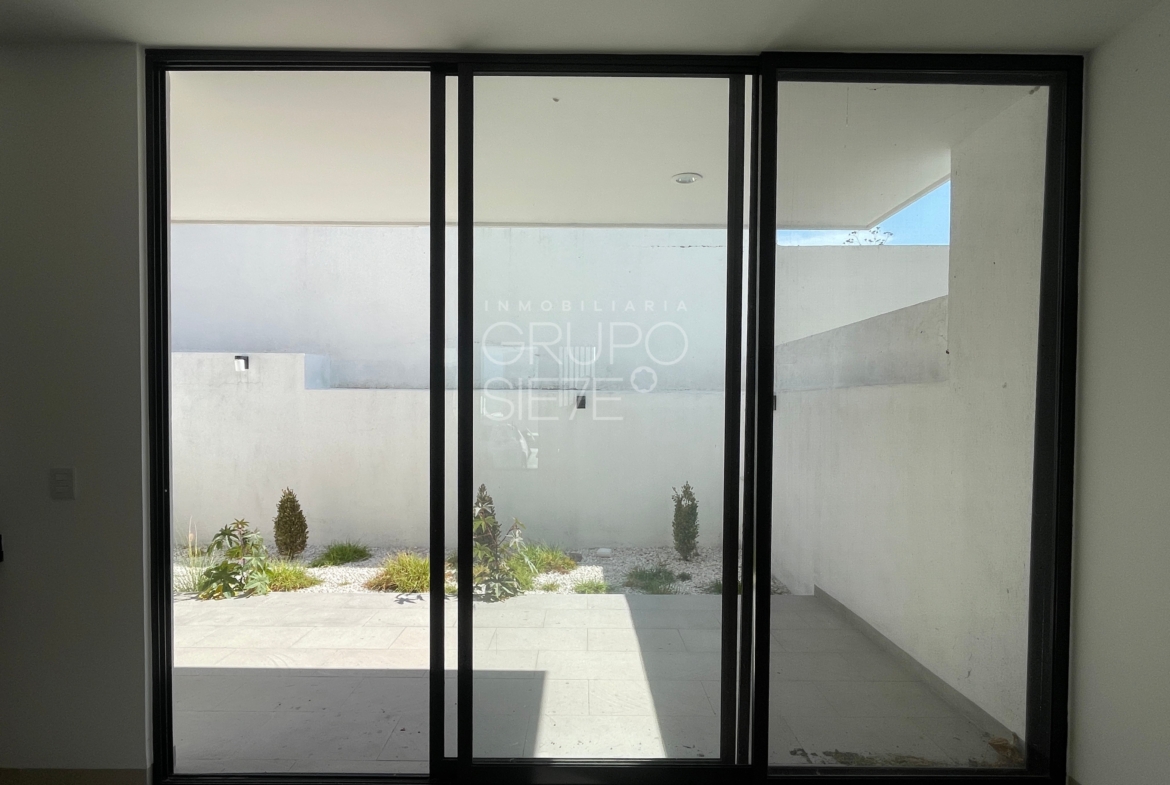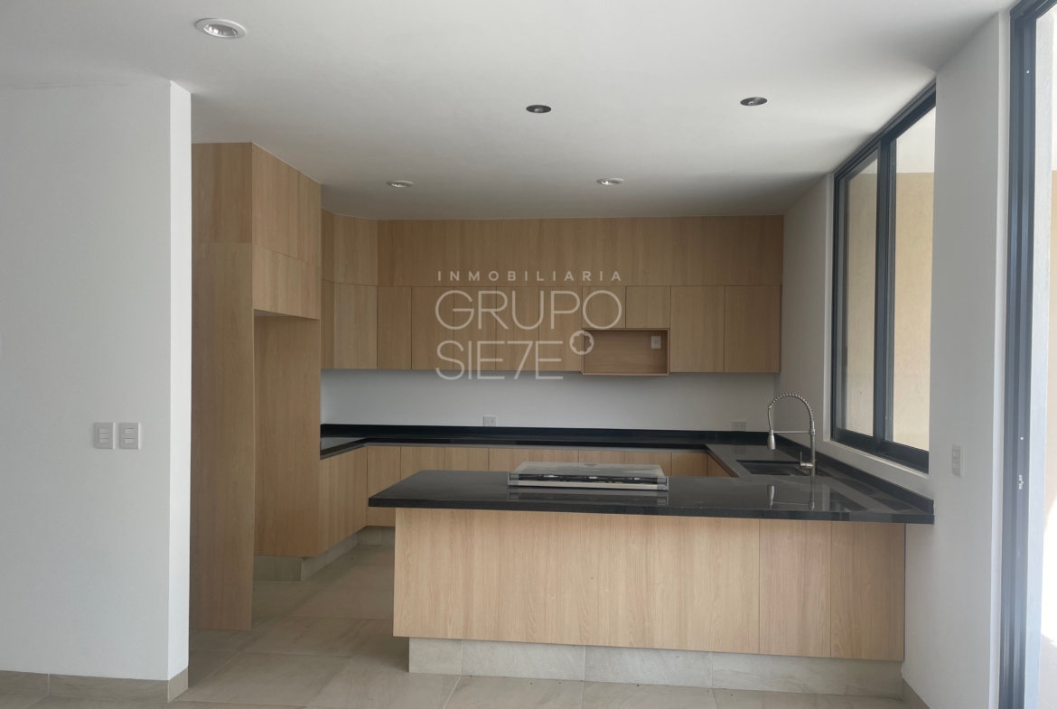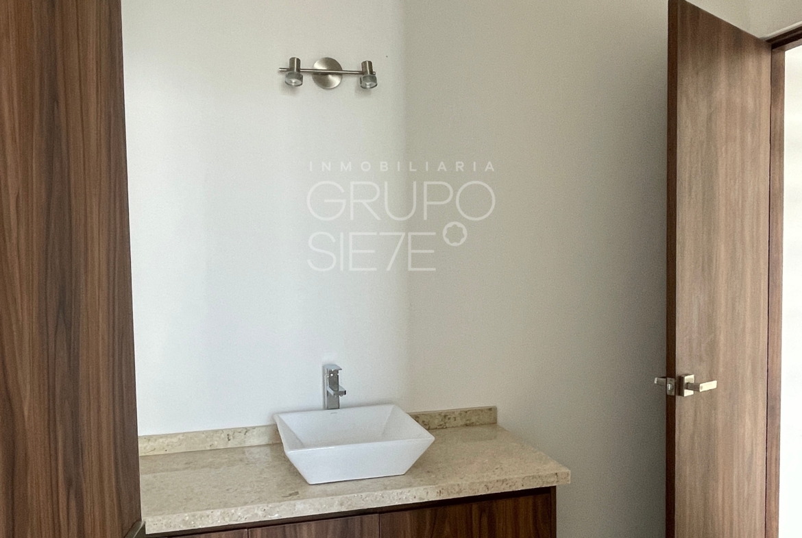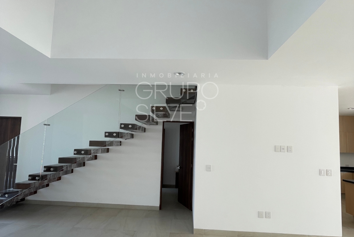 - Planta Baja: Una impresionante doble altura te recibe en la estancia. Sala y comedor integrados, amplia y lujosa cocina totalmente equipada, Estudio, o habitación de visitas con medio baño, área de servicio techado y patio posterior y bodega